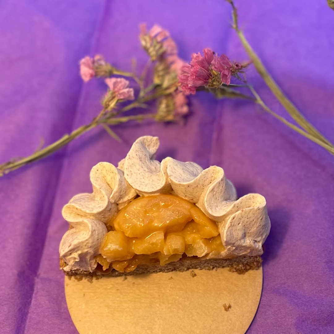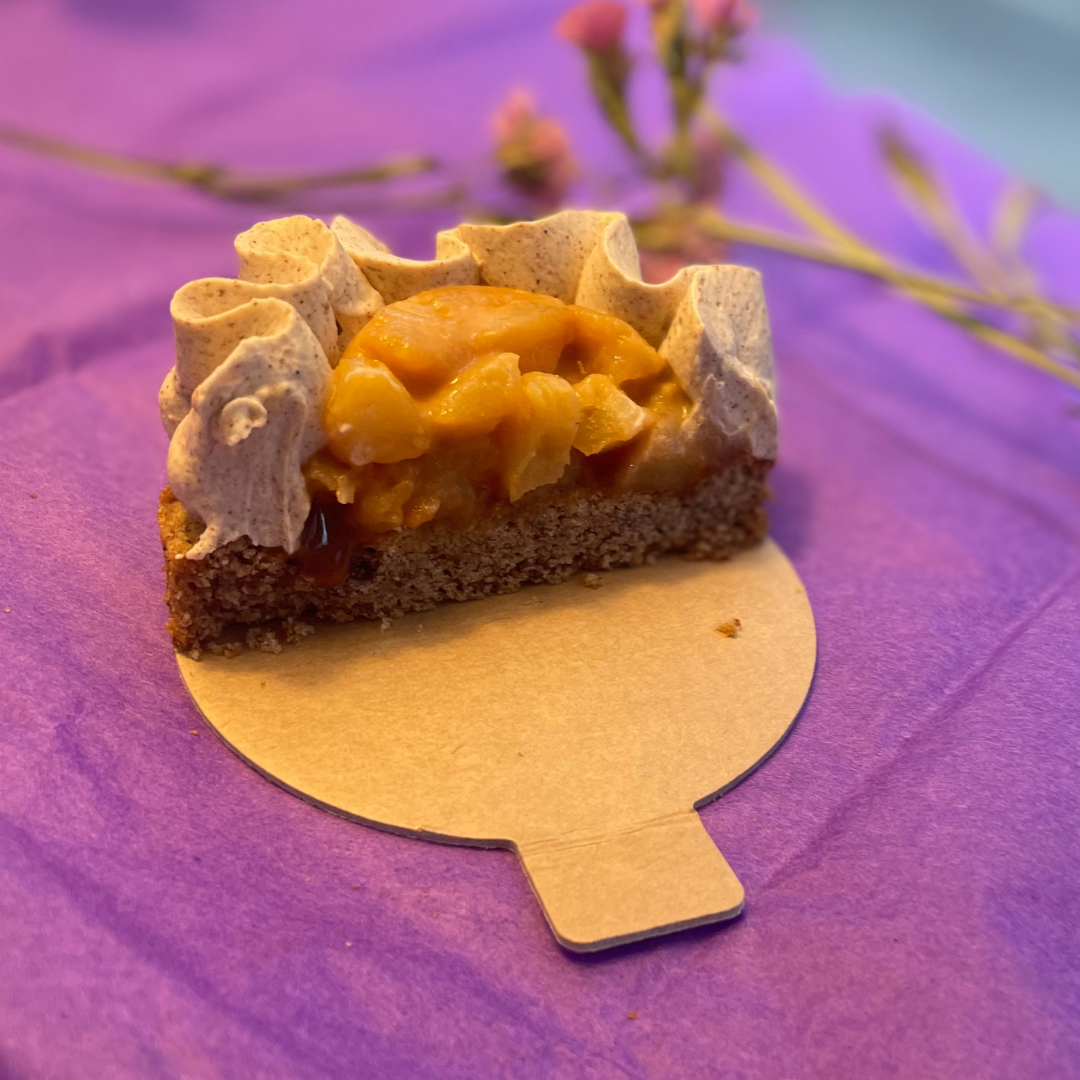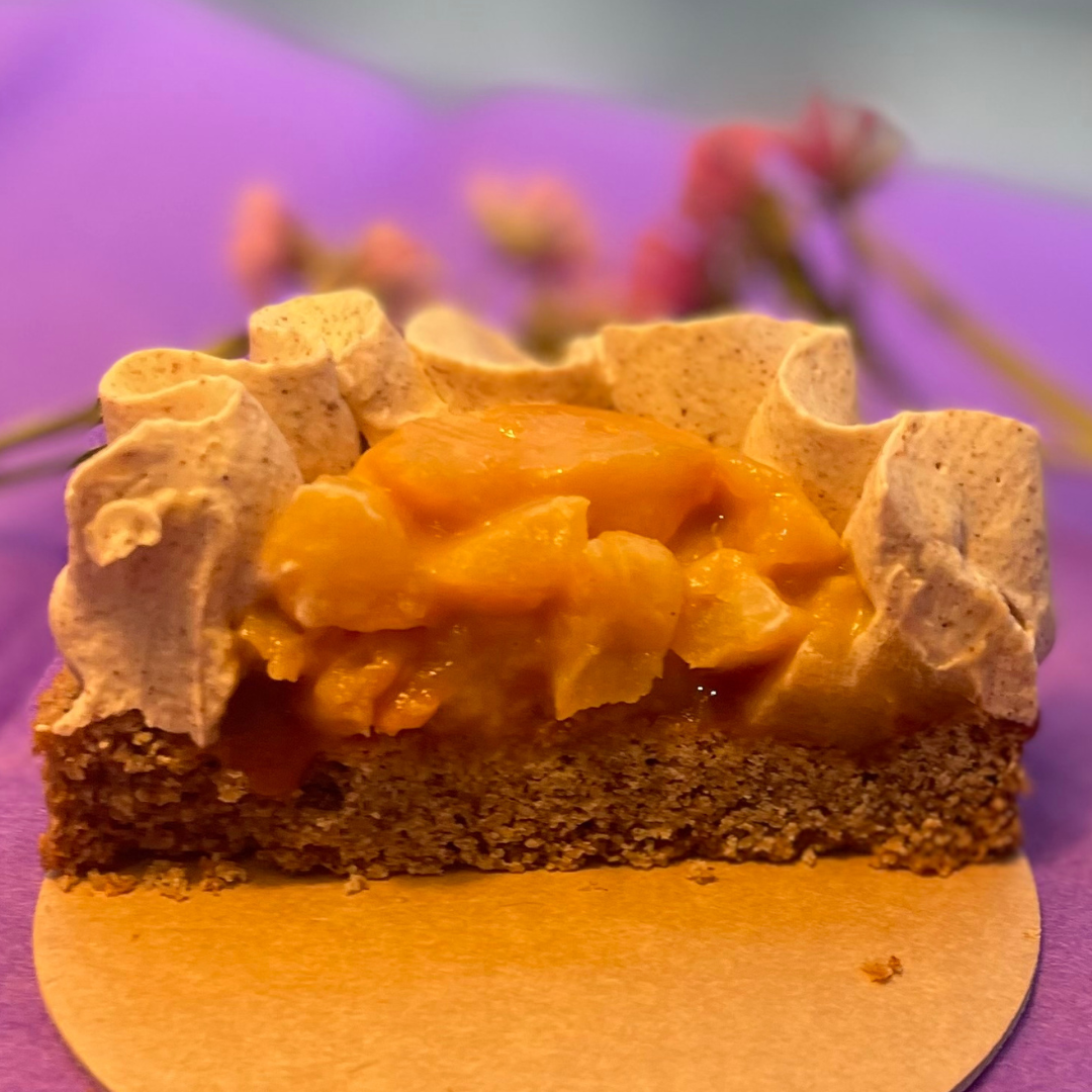 Cette douceur sans gluten et sans sucre ajouté (hormis dans le sablé) se compose se compose d’un sablé breton 100 % sarrasin (bio français) au beurre salé AOP, serti d’un dôme de pommes (bio, françaises) rôties caramélisées au jus de pomme (bio de France). L’ensemble est délicatement encerclé d’une onctueuse ganache montée au chocolat blanc parfumée à la cannelle bio.